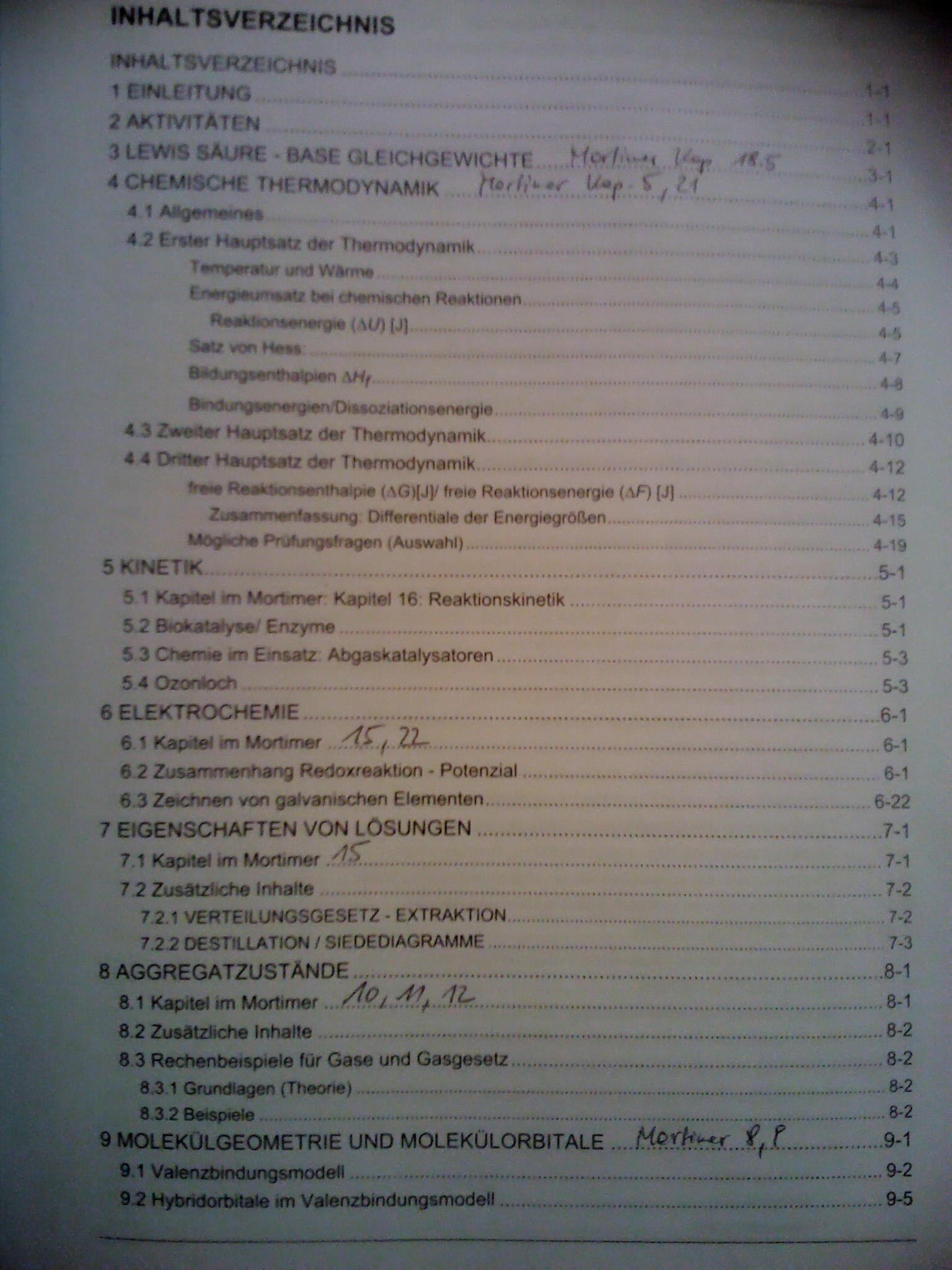 Hier der aktuelle Stoff aus dem 2011er Skript, mit Mortimer-Kapiteln (10.Aufl.) Volumetrie gehört dazu, aber nur SB-Titrationen. Kernchemie nicht! Und vom Periodensystem nur C,H,N,S,P,O, Na,K,Ca,Mg
