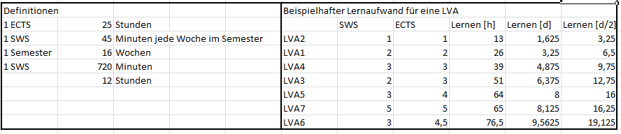 Nehmen wir eine fiktive LVA an mit 1 SWS und 1 ECTS. Wenn wir die Differenz aus beiden berechneten Stundenwerten bilden, erhalten wir die Zeit, die für Vorbereitung, Nachbereitung und Lernaufwand aufgewendet werden sollte, also im "Normalfall" den Lernaufwand. D.h. 25h - 12h = 13h. Das entspricht in etwa eineinhalb vollen Arbeitstagen (8 Stunden) oder etwa 3 halben Arbeitstagen (4 Stunden).