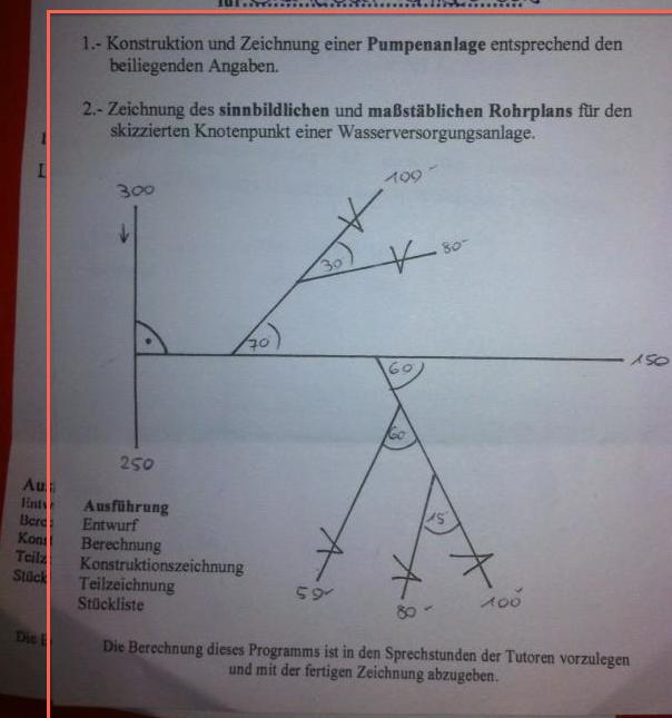 Ein kleiner Tipp noch: Wenn du für beide Rohrpläne den gleichen Maßstab verwendest, kannst du überprüfen ob du richtig gezeichnest hast (bzw gleich falsch gezeichnet hast *g*), indem du beide Pläne übereinander legst --> die Rohrlinien vom "einfachen Plan" sollten deckungsgleich mit den Mittellinien vom "komplizierteren Plan" sein.