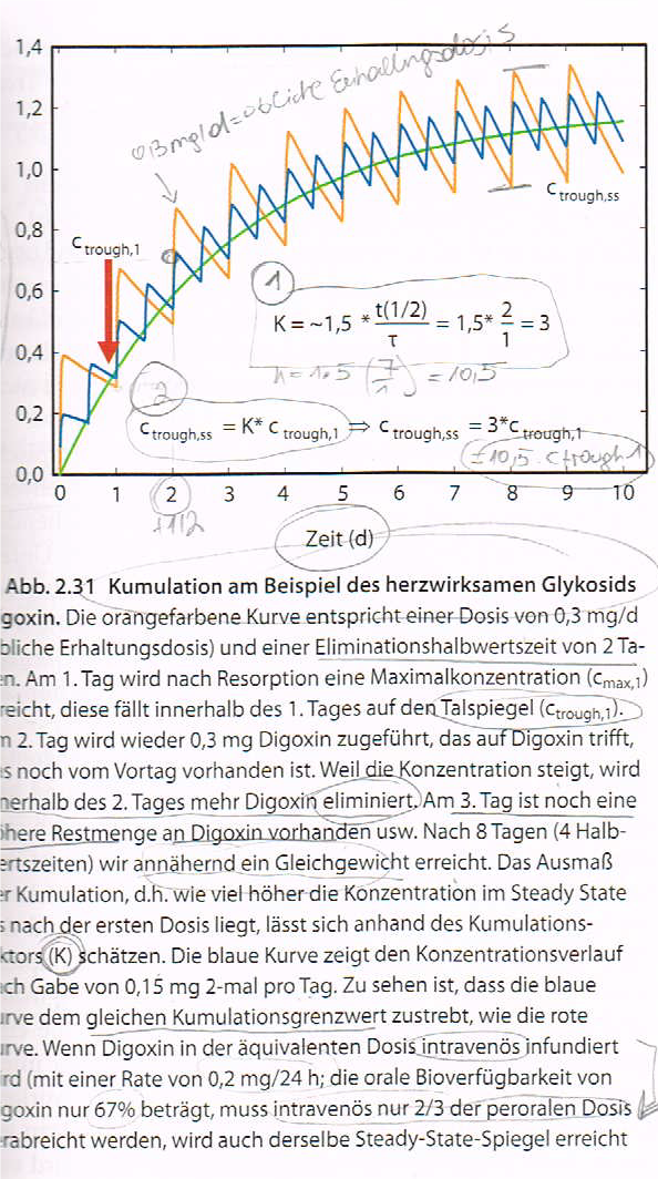 Das Ausmaß der Kumulation kann aus dem Verhältnis von Halbwertszeit und Dosierungsintervall τ geschätzt werden, der Kumulationsfaktor errechent sich als: