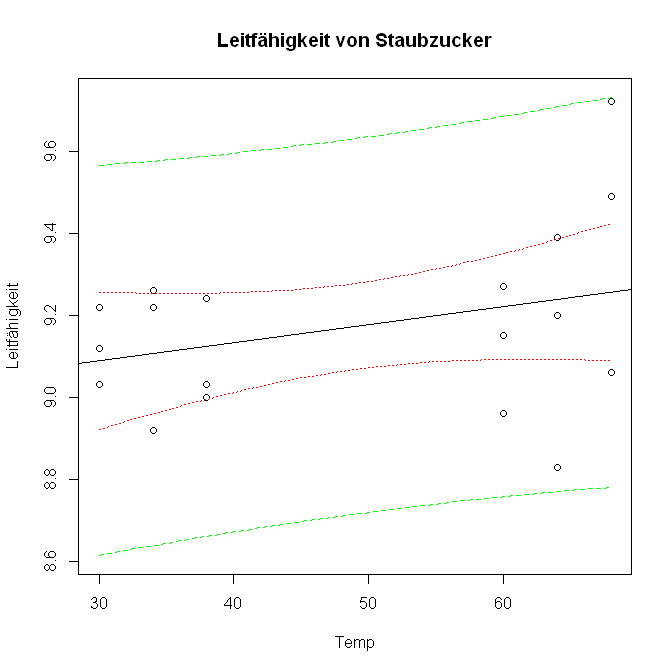 > plot (edv3$temp, edv3$leit, xlab="Temp", ylab="Leitfähigkeit", main="Leitfähigkeit von Staubzucker", ylim=c(min(vorhersageband[,2]), max(vorhersageband[,3])))