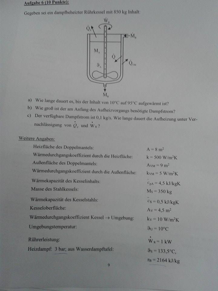 wie würdet ihr das rührkessel-bsp im anhang rechnen? im unterschied zu den rührkessel-übungsbeispielen fließt ja hier der heizdampf durch einen doppelmantel und nicht durch eine heizschlange! bei der berechnung der verluste muss man daher nicht nur den verlust, der über die kesseloberfläche verloren geht, berechnen (Qv),sondern auch den Verlust, der durch den doppelmantel verloren geht (Qvm). im skript gibt es zur berechnung der erreichten temperatur tetaA(unendlich) folgende formel: thetaA(unendlich) = thetaB + Wr - [(kA)v(thetaB + thetaU)]/[(kA)v + kA] thetaB ist die Temperatur des Heizdampfes (angegeben), Wr ist die Rührerleistung (angegeben), (kA)v ist der Verlust, der über die Kesseloberfläche verloren geht (angegeben) und kA bezeichnet den wärmedurchgangskoeffizient des doppelmantels x dessen heizfläche. soweit, so gut, aber bei dieser rechnung muss ich doch auch den verlustwärmestrom, der vom doppelmantel nach außen verloren geht, berechnen, würd ich mal sagen (?). Im skript ist in dem zusammenhang von (kA)vm die rede, entsprechende angaben gibt es auch am angabenblatt. aber wie ändert sich obige formel dann? hat jemand eine idee?