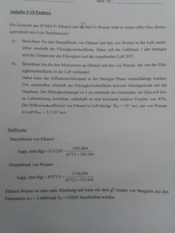 @ Rührkessel Bsp: Eigentlich hab ich mir die Formel nur so überlegt, steht nirgends im Skriptum drinnen: KA(V) ist ja der Deckel, der tauscht im Grunde nur Wärme zwischen Umgebung und Inhalt. Inhalt hat zu Beginn 10°C und Umgebung auch 10°C dh der ganze Term kürzt sich weg. KA(VM) ist die Außenseite des DM, auf der Innenseite hast du die Temp des Dampfes und Außen die 10°C der Umgebung. Also wenn das Bsp. bei der Prüfung so kommt werd ichs so hinschreiben wie ichs oben durchgerechnet hab und noch begründen warum ich die Formel so angesetzt hab. Wird schon schiefgehen @Eth/Wasser a) selber Rechengang aber ich komm auf Unterschiedliche Zahlenwerte Eth = 0.525 bar Wasser = 0,398 bar b) wieder selber Rechengang aber falsche Zahlenwerte da die Werte ja aus a) übernommen werden  Was mich an dem ganzen b) stört ist das als Abschlusseinheit mol / (s*m³) rauskommt, das passt nicht wirklich zusammen mit dem was im Skriptum bei Diffusion steht ...