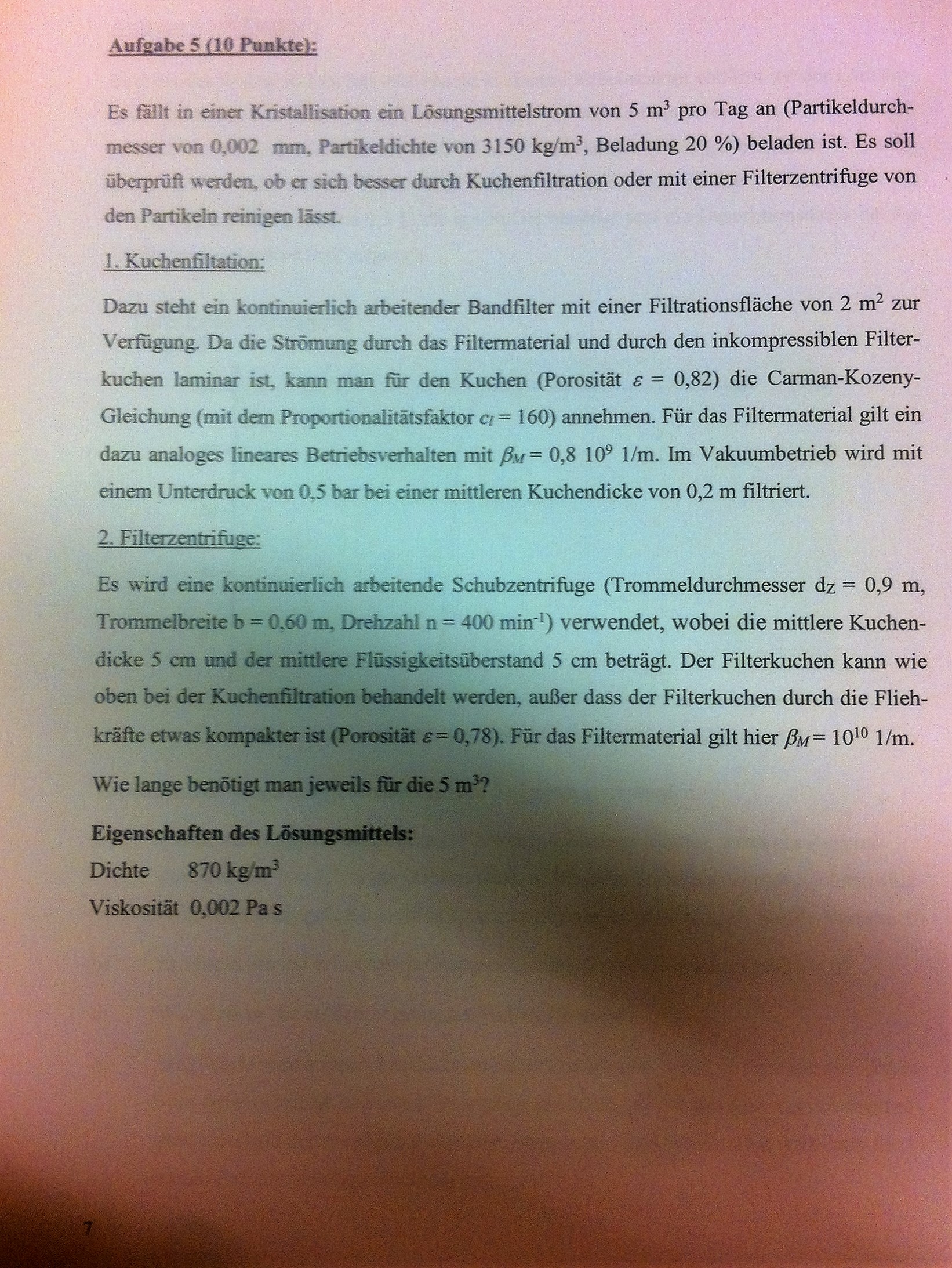 Also ich habe mir bei der Kuchenfiltration mittels der Gl. 3.12 S4 den Volumenstrom ausgerechnet und dann t = V/Volumenstrom Bei der Filterzentrifuge habe ich die Gl. 3.50 S.32 verwendet und dann mit t = v/Volumenstrom gerechnet