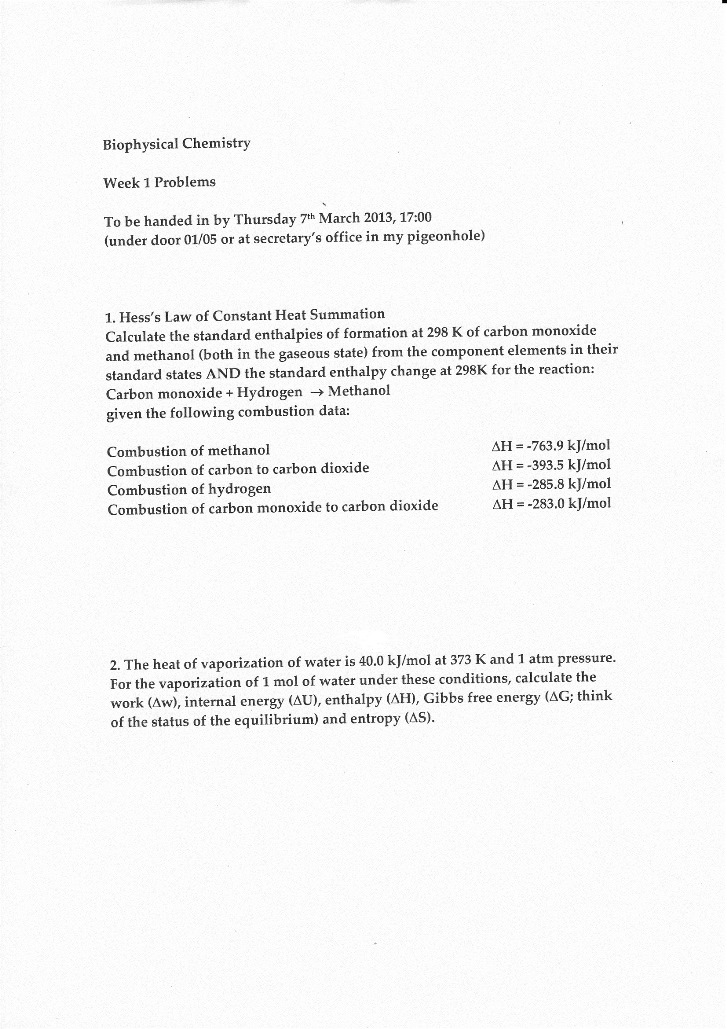 aber wenn ihr ein equilibrium annhemt dann ist doch die arbeit auch null.. wieso habt ihr dann für delta w=3,1 und nicht null??? Gottschalk hat geschrieben: ...beim 1. Beispiel hab ich genau die gleichen Ergebnisse  ... ...beim 2. Beispiel hab ich: Δw= 3,1 KJ/mol; ΔU= 36,9 KJ/mol; ΔH= 40 KJ/mol; ΔG= bin ich mir nicht sicher, aber ich nehm an 0; ΔS= 0,107 KJ/molK... Wär super, wenn irgendwer sonst noch seine Ergebnisse posten könnte, um diese vergleichen zu können...