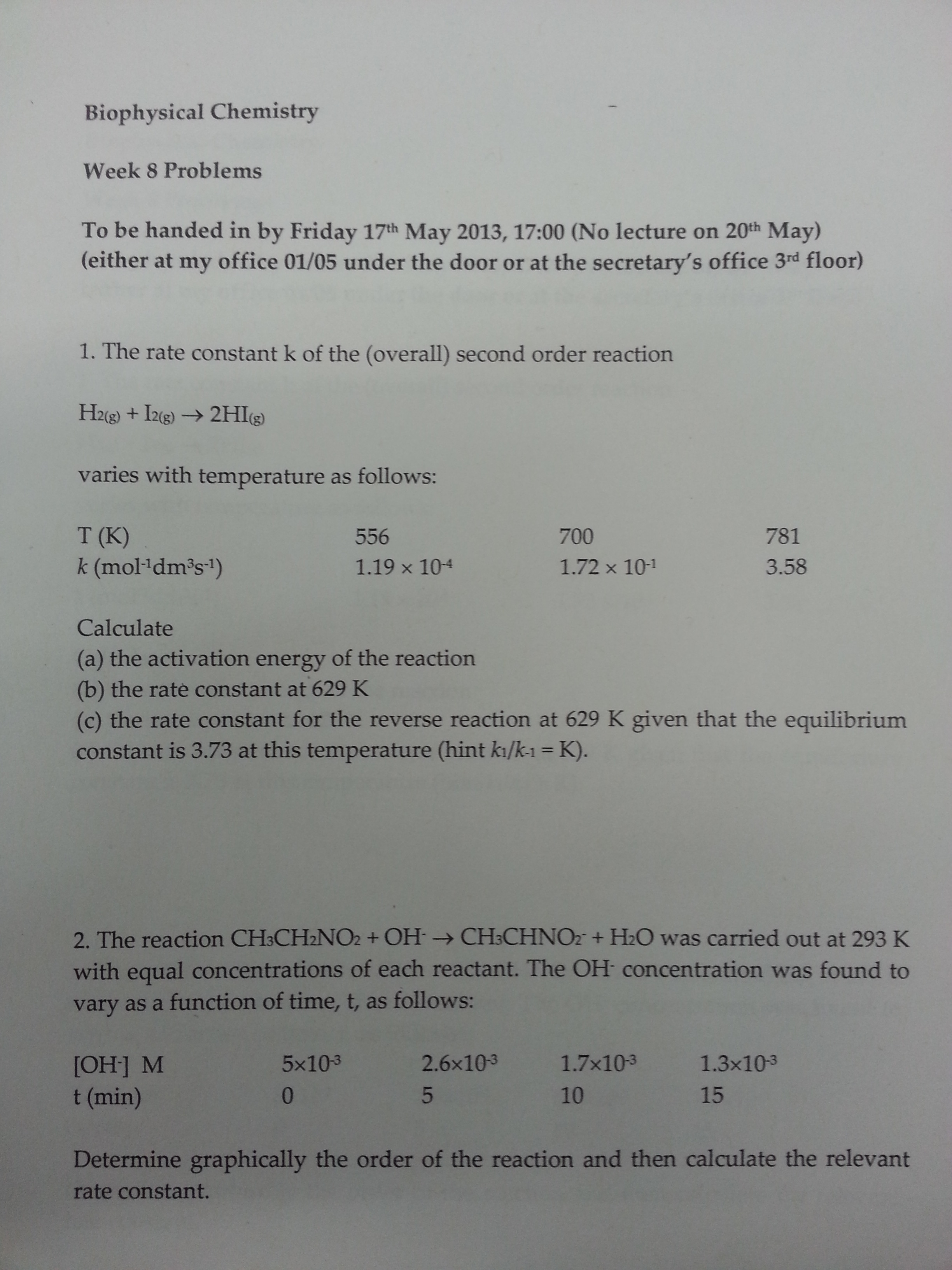 2. Ordnung habe ich auch. Als Steigung habe ich auch 38,22. war aber nicht sicher, ob ich diesen Wert nehmen sollte, da ja in der Aufgabe steht "calculate". Deshalb habe ich die Formel [A]t = 1/ (2k*t+(1/[A]0)) zur Berechnung der Rate bei 2. Ordnung verwendet...