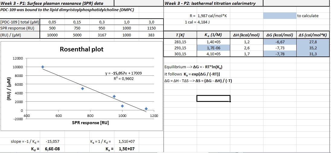 P1 habe ich mit Rosenthal gelöst und für gebundenen Ligand auf der x-Achse einfach die RUs genommen. Die y-Achse sind die RUs durch den zugegebenen Liganden dividiert und dann mit einer linearen Trendlinie ergänzt. Aus der Steigung folgen und Kd (6,6E-8(M)) und Ka (1,5E+7(M-1))