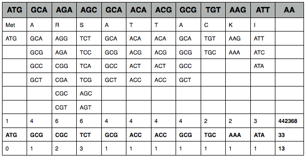 M : 1 mögliches Codon A : 4 R : 8 S : 16 A : 4 T : 4 T : 4 A : 4 C : 2 K : 2 I : 3