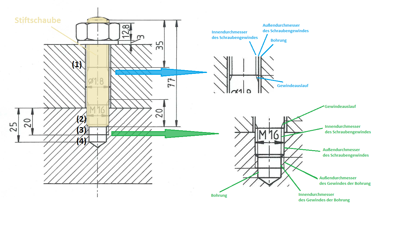Im Bereich (3) sieht man jenen Teil des Gewindes der Bohrung, in dem die Schraube NICHT steckt *); also nur das Innengewinde; die Schraffur geht bis zum Innersten Teil des Gewindes **)