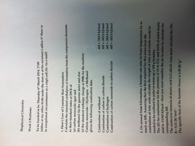 Edit: Für T kannst du glaub ich 30 K einsetzen. Wir haben ja ΔU der Verbrennung gegeben, also zählen auch nur die Verbrennungsprozesse. Egal wo du Stearinsäure verbrennst: Sie gibt am Nordpol nicht mehr Energie als in der Wüste.