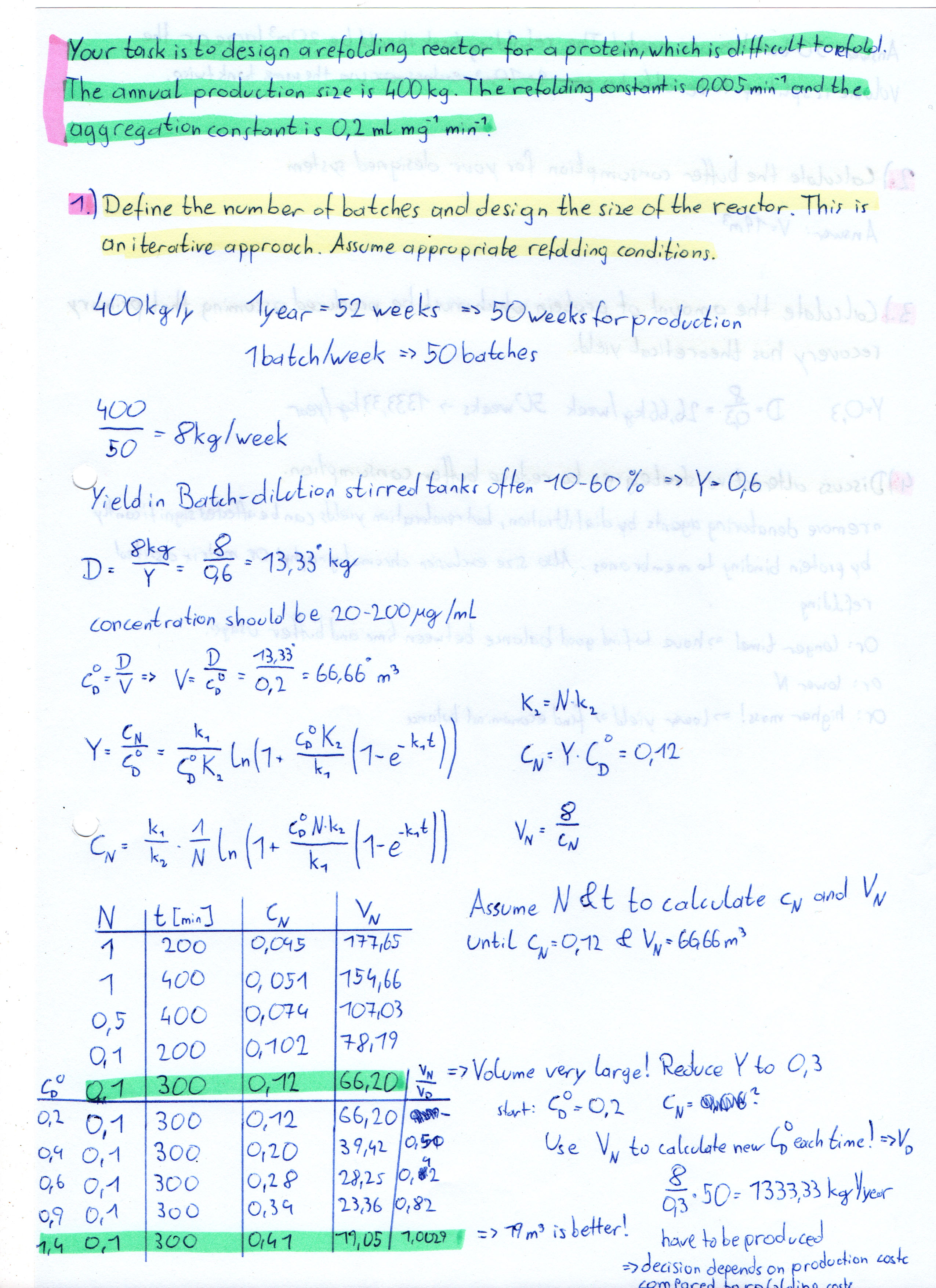 Im Anhang mal mein Lösungsvorschlag. Ich bin Stunden an diesem Beispiel gesessen und daran verzweifelt, dass unser lieber Herr Professor uns Beispiele zu lösen gibt, für welche man Formeln anwenden muss, wo die Hälfte der Variablen nirgendwo erklärt stehen. Natürlich wird das Thema Protein Refolding im empfohlenen Lehrbuch der Frau Doran erst gar nicht wirklich behandelt. Den Hinweis mit der Aggregation number findet man in einem Paper vom Prof, was einem während der Prüfung natürlich nichts nützt. Dazu kommt, dass im Paper selbst weder Einheiten noch Größenordnungen zu finden sind, so dass es wirklich auf ein Ratespiel hinausläuft. Die vom Prof zitierte Quelle hingegen können wir nicht öffnen, da die Verträge der BOKU-Bibliothek mit Nature offensichtlich nicht weit genug reichen, um Studenten und Forschern des größten Fachbereichs der Uni Zugang zu diesem Paper in Nature Biotechnology zu ermöglichen. Oder Nature beschränkt den Zugang zu gewissen Papers absichtlich. Dementsprechend habe ich für meine Lösung N und t geraten, auch wenn ich bezweifle, dass man N wirklich frei wählen darf. Bei self-assembly Geschichten verwendet man N gerne für die Menge an einzelnen Partikeln in einem Aggregat, so dass N größer als 0 und auch eine ganze Zahl ist. Vom Gedanken her hätte ich gemeint, dass das auch hier bei Proteinaggregaten Sinn machen würde, aber sinnvolle Ergebnisse bekomme ich nur bei N-Werten kleiner als 1. Schade, dass man in den VO-Unterlagen natürlich keinerlei Referenzwerte oder IRGENDETWAS nützliches findet. Dafür viele unerklärte Formeln und Bildchen.