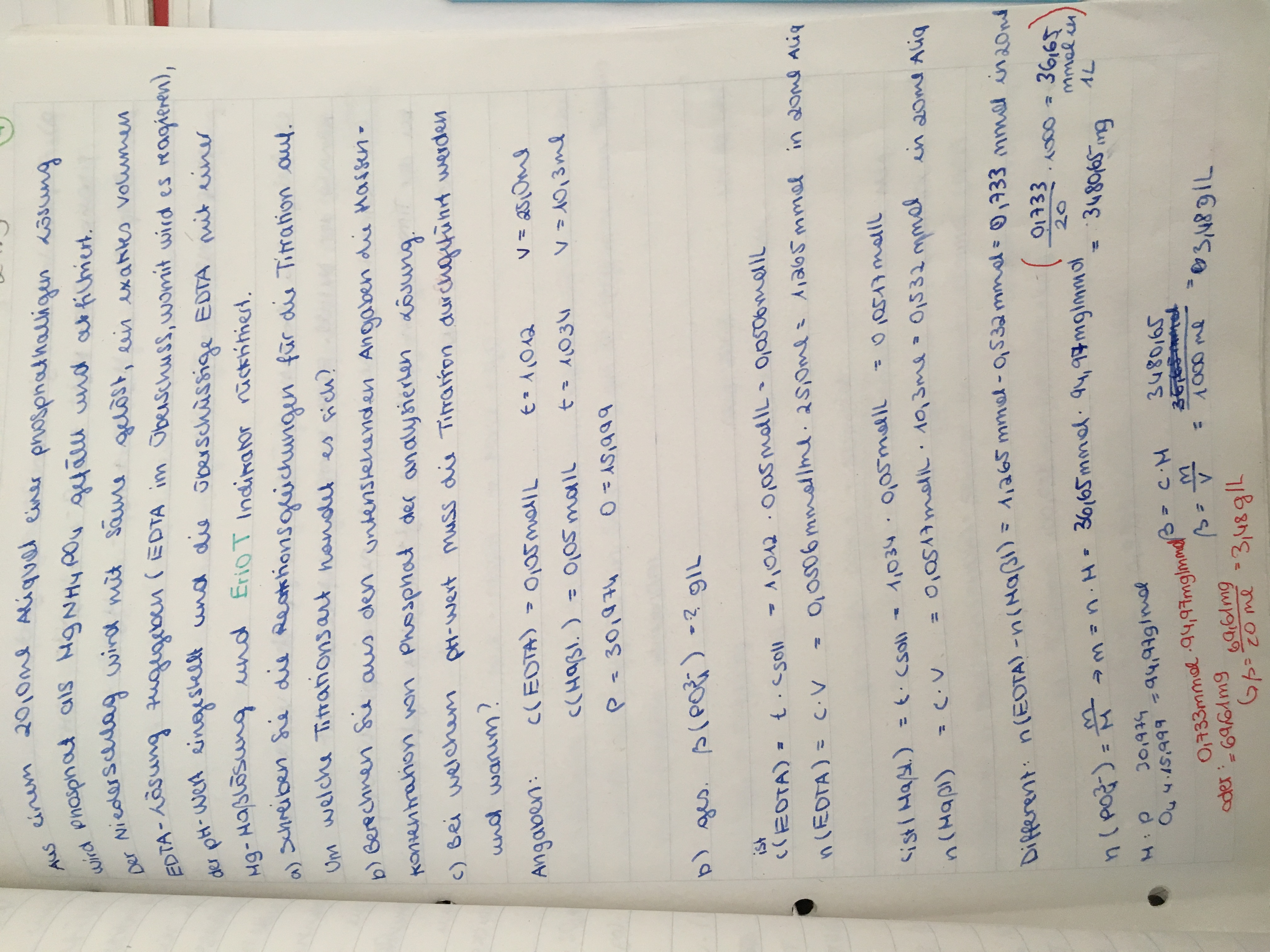 Angaben: C(EDTA)= 0,05 mol/L, Titer(EDTA)=1,012, V(EDTA)=25,0 mL, c(Maßlösung)=0,05mol/L, Titer(Maßlösung)=1,034, Verbrauch an Maßlösung am ÄP= 10,3 mL, Ar(P)=30,974, Ar(O)=15,999